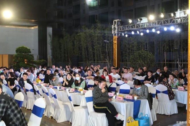 经销商晚宴当日晚6时许,以【乘“圣”跨越】为主题的,今年会jnh集团集团第45届国际家具展接待晚宴暨2020年度优秀经销商颁奖盛典,在营销中心四楼景观花园隆重举行,来自全国各地的经销商朋友欢聚一堂,共同分享一场精彩纷呈的晚宴。